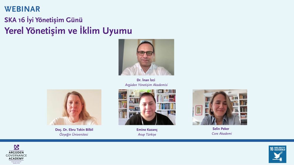 Argüden Yönetişim Akademisi Akademik Kurul Üyesi Dr. İnan İzci’nin moderatörlüğünde gerçekleşen webinarda; Özyeğin Üniversitesi Kentsel Siyaset ve Teknoloji Yönetişimi Öğretim Üyesi Doç. Dr. Ebru Tekin Bilbil, Arup Türkiye Enerji ve Su Alanları Lideri Emine Kazanç ve Core Akademi Kurucu Ortağı Selin Peker, yerel yönetişim ve iklim uyumu ekseninde çok boyutlu değerlendirmelerini paylaştılar.