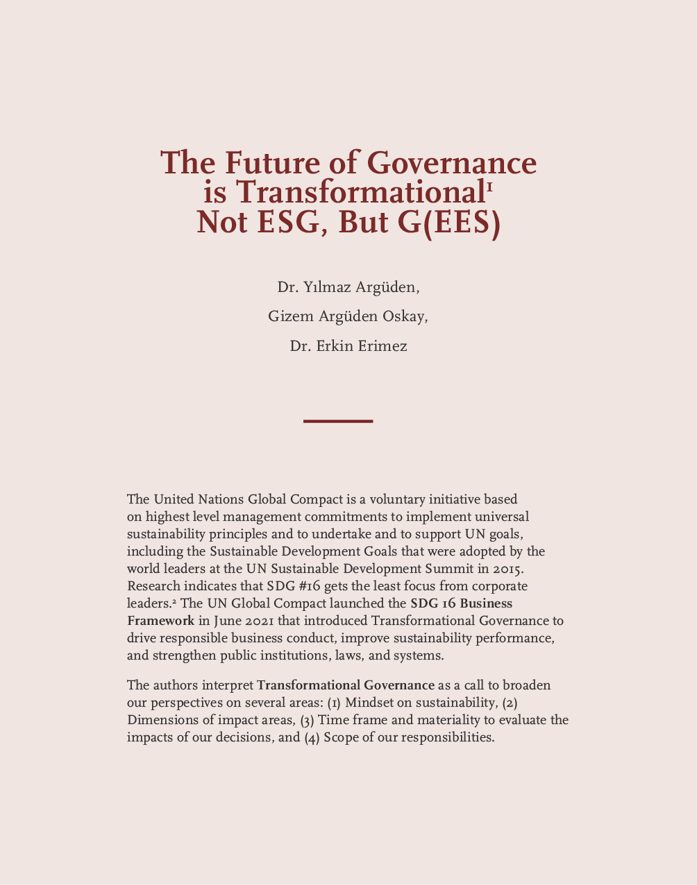 UN Global Compact tarafından kurulan Transformational Governance Thinklab kapsamında düzenlenen Liderler Zirvesi’nde, Mütevelli Heyeti Başkanımız Dr. Yılmaz Argüden Yönetişimin Dönüştürücü Gücü başlıklı bir konuşma yaptı. Aynı kapsamda paylaştığı makalede, sürdürülebilirliğin yalnızca ESG raporlamasıyla sınırlı ele alınamayacağını; yönetişimin merkeze alındığı G(EES) yaklaşımıyla çevresel, ekonomik ve sosyal etkilerin bütünsel biçimde ele alınması gerektiğini vurguladı.